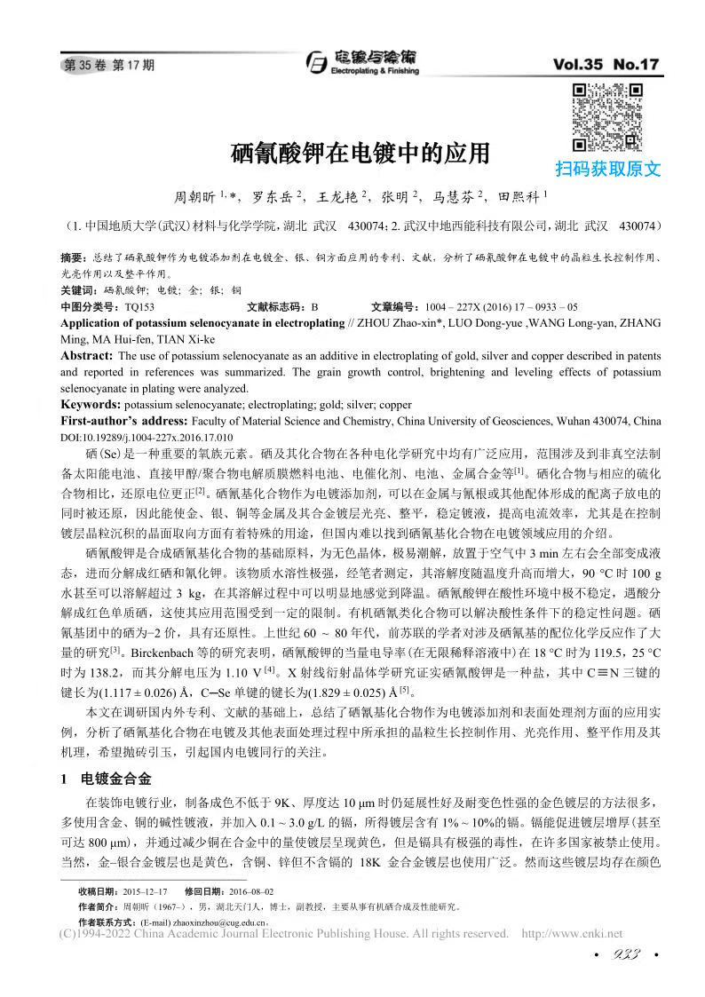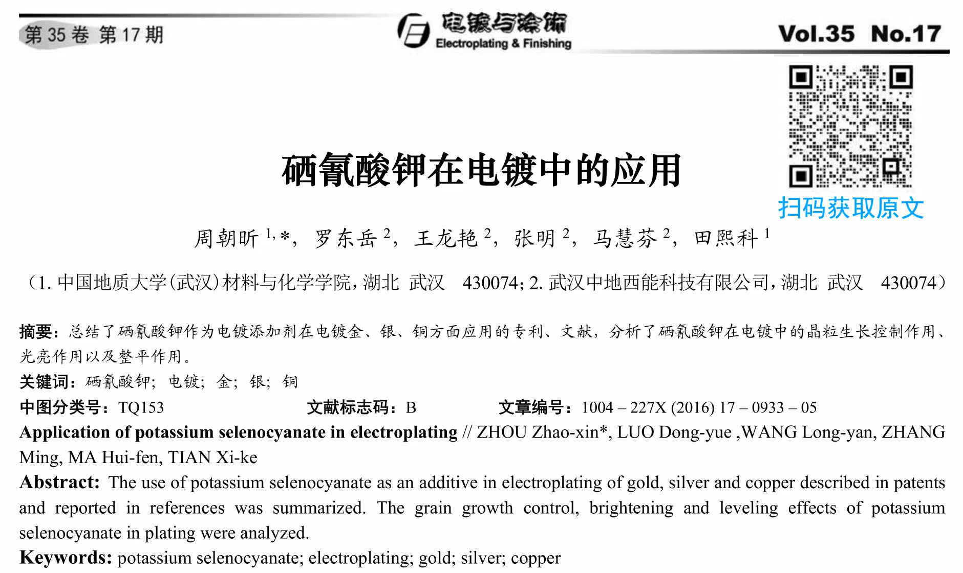 本文在調(diào)研國(guó)內(nèi)外、文獻(xiàn)的基礎(chǔ)上,總結(jié)了硒氰基化合物作為電鍍添加劑和表面處理劑方面的應(yīng)用實(shí)例,分析了硒氰基化合物在電鍍及其他表面處理過(guò)程中所承擔(dān)的晶粒生長(zhǎng)控制作用、光亮作用、整平作用及其機(jī)理,希望拋磚引玉,引起國(guó)內(nèi)電鍍同行的關(guān)注。