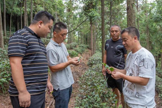縣茶葉辦的領(lǐng)導(dǎo)和專家在產(chǎn)園指導(dǎo)田熙軍(左2)林下野生綠茶生產(chǎn)